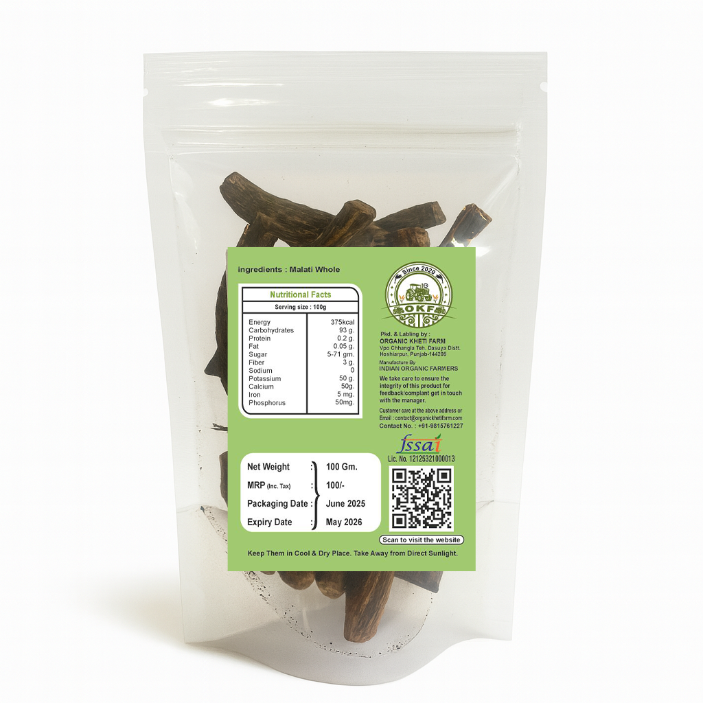 Boost wellness naturally with Organic Kheti Farm’s Mulethi (Licorice Root) — a treasured herb in Ayurveda known for its soothing flavor and powerful health benefits. Carefully dried to retain all its natural nutrients, Mulethi is perfect for teas, remedies, and holistic wellness.