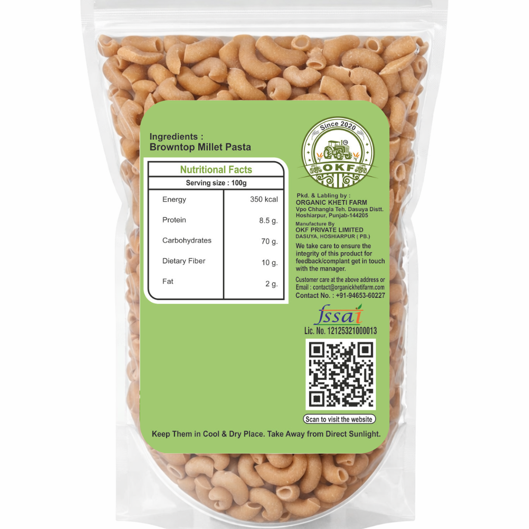 Wholesome, natural, and delicious — Organic Kheti Farm Browntop Millet Pasta is made from premium quality browntop millet, carefully processed to retain natural nutrients. From our farm to your table, this pasta is pure, organic, and naturally grown for a healthier lifestyle. A perfect alternative to regular pasta, offering taste along with complete nutrition.