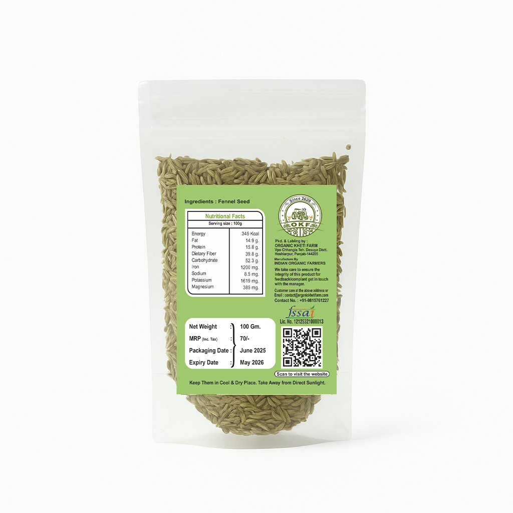 Freshly packed and bursting with natural aroma, Organic Kheti Farm’s Fennel Seeds are a must-have spice for your kitchen and health. Traditionally used for digestion and breath freshening, these seeds are a post-meal favorite.