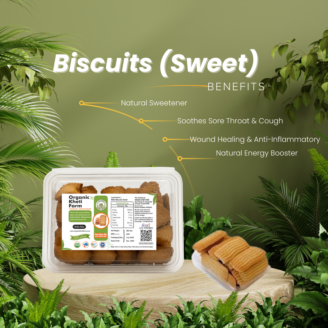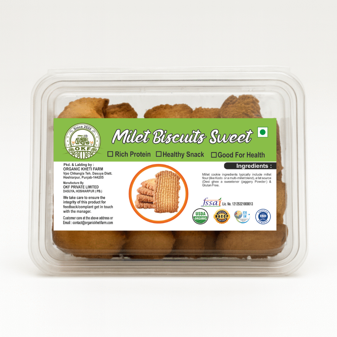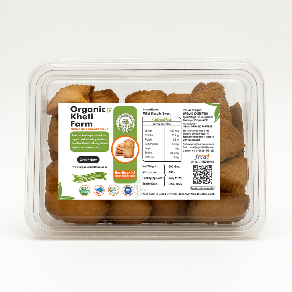 Enjoy the same crunchy delight in a premium tray pack with Organic Kheti Farm’s Millet Biscuits – Desi Style. Loaded with the goodness of ancient millets and crafted with love, this pack is perfect for home, office snacking, or festive gifting!